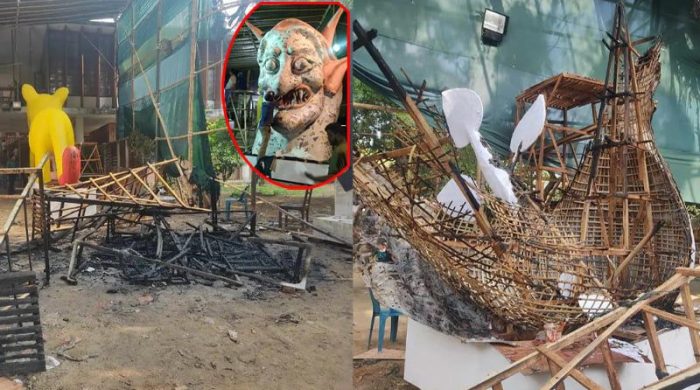 ঢাকা বিশ্ববিদ্যালয়ের (ঢাবি) চারুকলা অনুষদে পয়লা বৈশাখ উপলক্ষ্যে আনন্দ শোভাযাত্রার জন্য তৈরি করা মূল মোটিফ ‘ফ্যাসিস্টের প্রতিকৃতি’তে আগুন দিয়েছে দুর্বৃত্তরা। এতে মোটিফটি সম্পূর্ণ পুড়ে গেছে। আজ (শনিবার) ভোরে এ ঘটনা