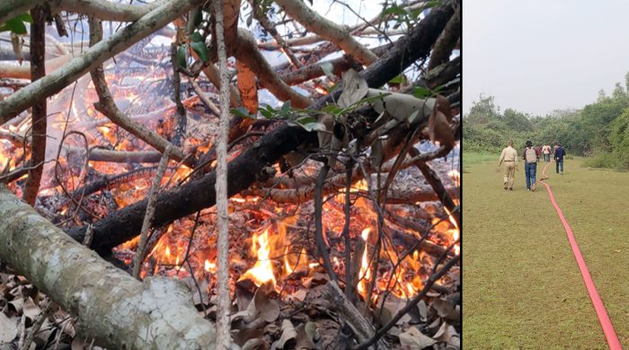 সুন্দরবনের পূর্ব বন বিভাগের চাঁদপাই রেঞ্জের ধানসাগর এলাকার তেইশের ছিলা নামক স্থানে নতুন করে লাগা আগুনের তীব্রতা কিছুটা কমেছে। তবে পানির উৎস দূরে থাকায় এবং ভাটার কারণে নদী শুকিয়ে যাওয়ায়